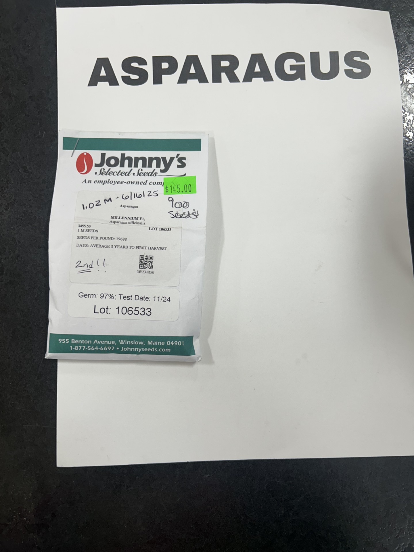 I received seeds two weeks ago. All 12 seeds I planted germinated, can't do better than that! As to the asparagus harvest, that will take a few years but I'm hopeful. I had some 'millennium' in the garden in previous years and only a couple overwintered (zone 4b), so this time around I'll give 'em a sunnier spot with a larger space of their own so they won't get shaded as much by other plants.